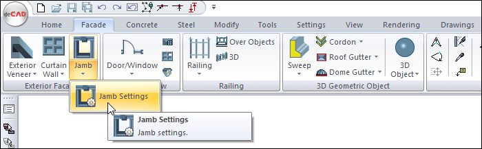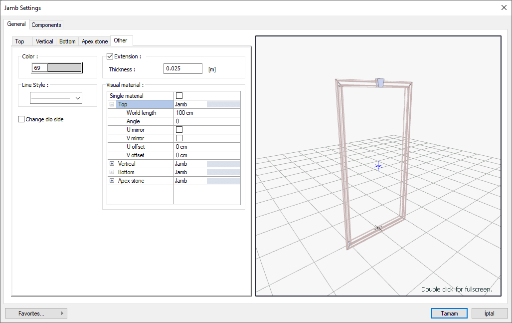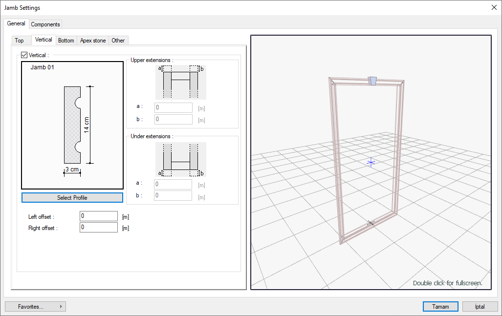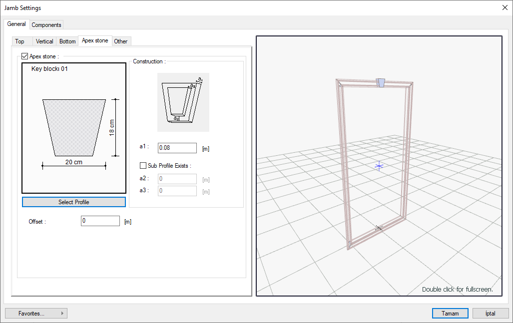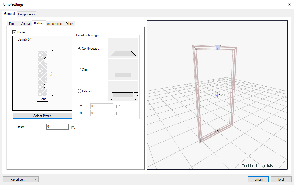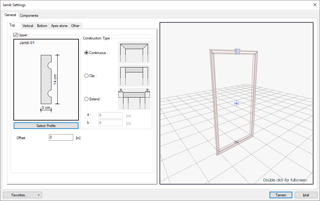 With the Jamb Settings command, settings such as profile selection, construction type, offset distance, material selection are accessed. Jamb settings vary according to the top, bottom, vertical and apex stone sections. According to the architectural design, those required from these sections are closed.