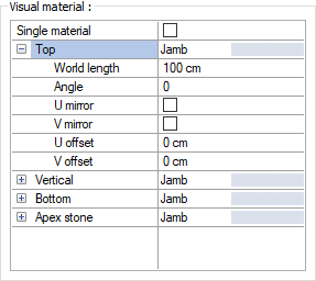 Material appearance ![]() The material to be used on the top, vertical, bottom and apex stone parts of the jamb is selected from the list. Surfaces are covered with the selected material and displayed as such in renderings. Texture length is entered into the world length. For example; If 1 is entered, the selected material texture is taken as 1 meter and covered on the relevant walls. In the angle, the angle of the texture is entered. Touch the U and V offset. The motion value in the x and y plane is entered. With U and V mirroring, the texture is symmetrical with respect to the y and x planes. By selecting the single material option, the material selected in "Top" is used on all surfaces of the jamb. |