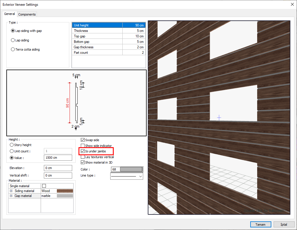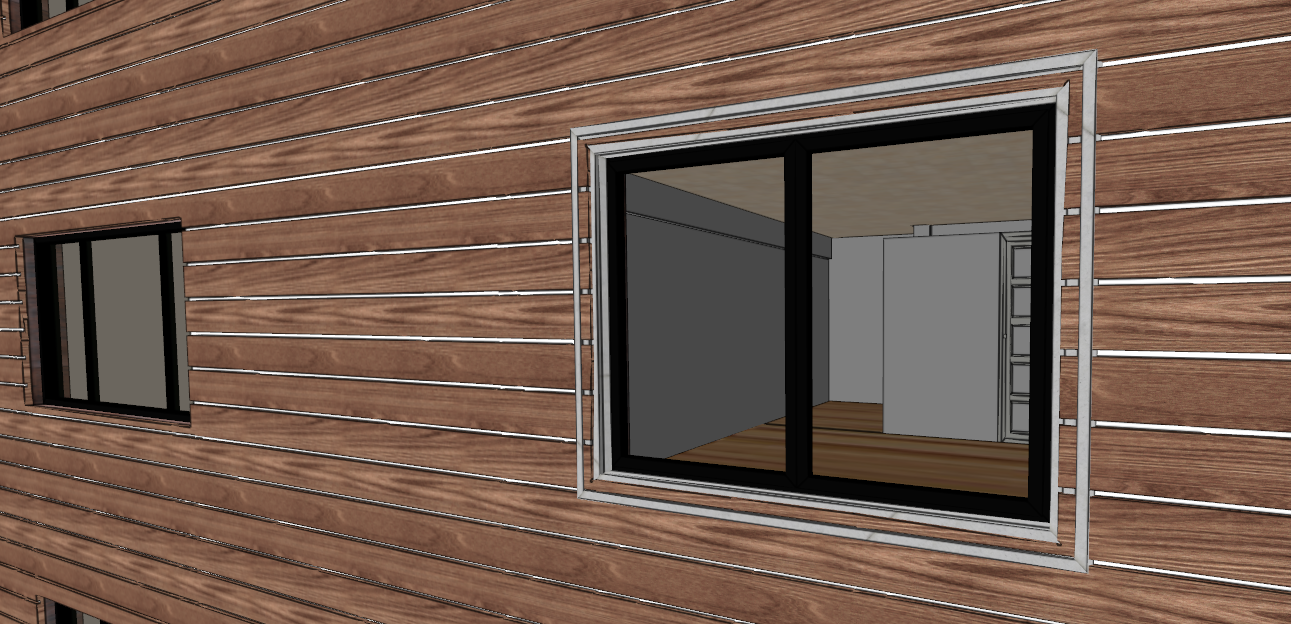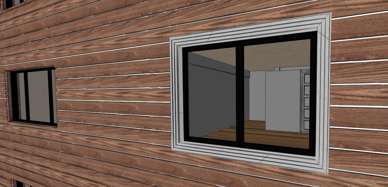 The jamb is defined with the Is under jambs feature on the exterior veneer. By marking the feature under the jamb, the exterior veneer element is extended to the window/door space under the jamb element. If it is not marked, it finishes the exterior veneer on the edge of the jamb, surrounding the jamb.