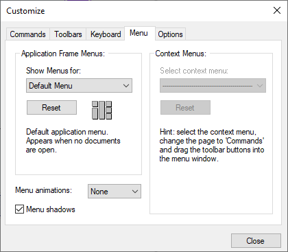 Application frame menus ![]() Clicking on Reset will bring the menu into its original state. |