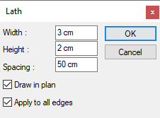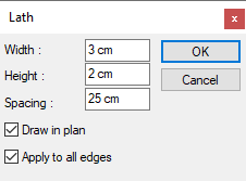 Draw in plan ![]() If the laths are wanted to be displayed in the plan, it is marked. If not marked, the laths are not drawn in the plan but displayed in the elevation and section windows. |