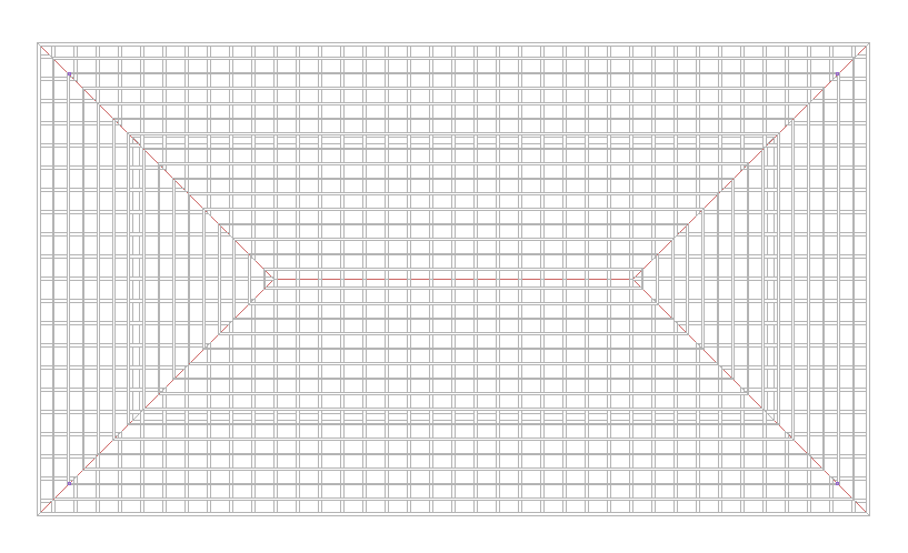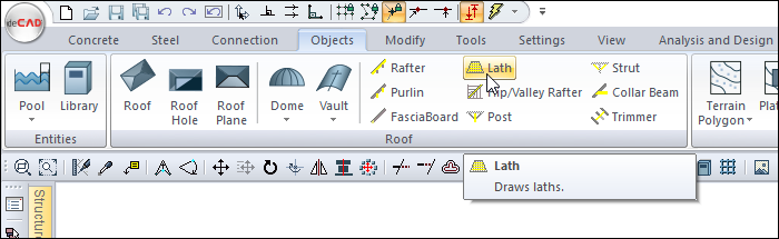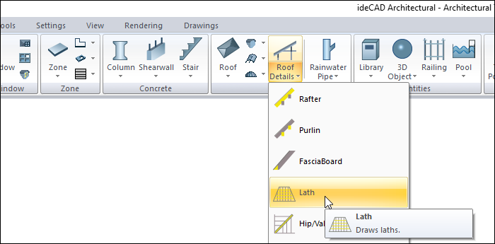 Laths are roof elements that are drawn on the rafters, perpendicular to the rafters. Lath roof detail is created with the lath command.