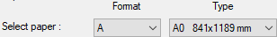 Select paper ![]() One of the A, B, C, US and free formats is selected from the list, and the paper type of the formats is selected from the type list. When paper type is selected, the dimensions of the selected paper appear in the Width and Height rows. |