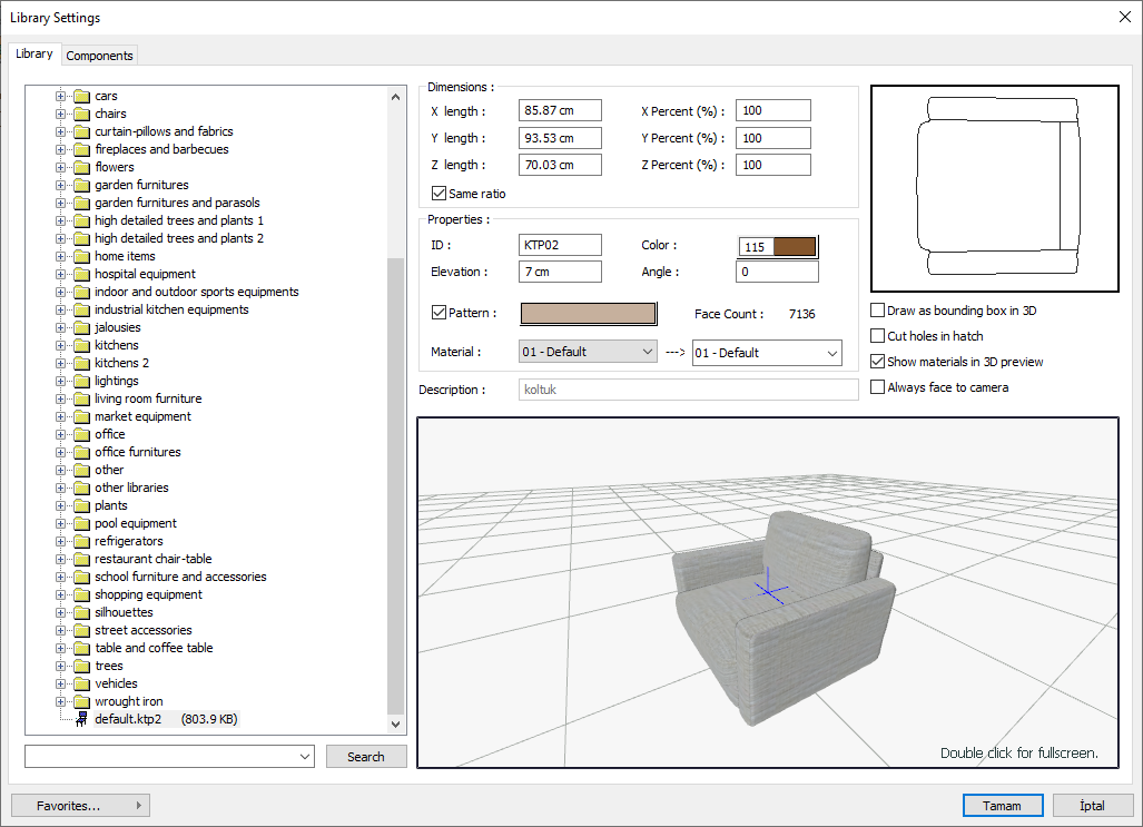 The library object can be placed directly on the hatch. The cleaning of libraries placed on hatch depends on activating the Cut holes in hatch option in the library settings. If this option is selected, the hatch is cleared when the library is placed on the hatch, if not checked it is not cleared.