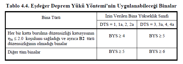 4.6.2.2 - Buildings to which the Equivalent Earthquake Load Method , details of which are explained in 4.7 , can be applied are given in Table 4.4 .