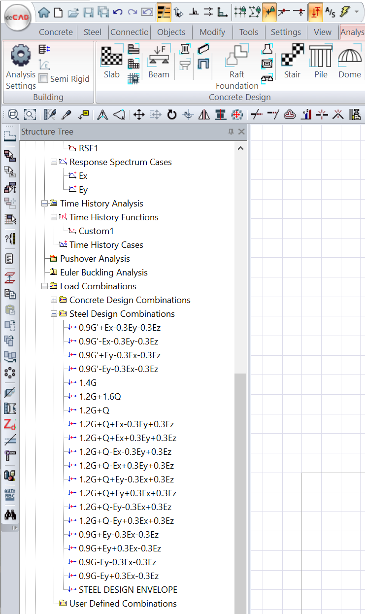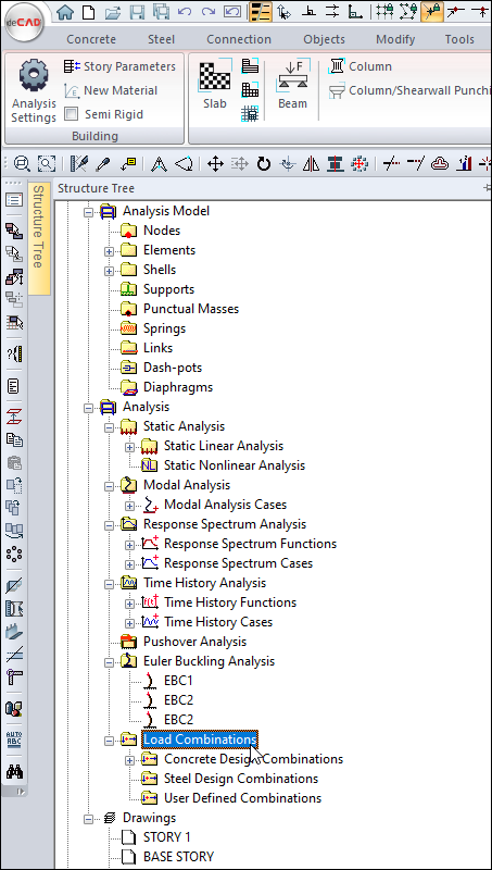 Load combinations are displayed in the sturcture tree under the Analysis folder.