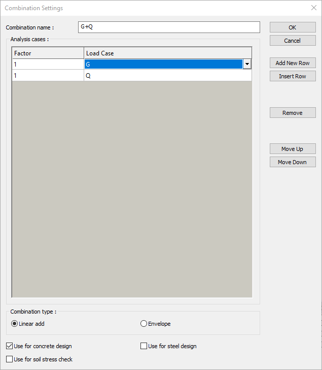 From the load case, select the load for which you want to complete the combination and enter its factor.