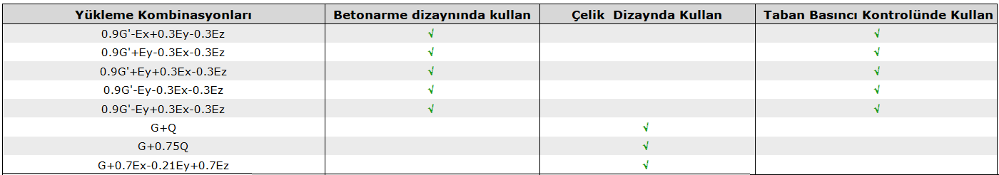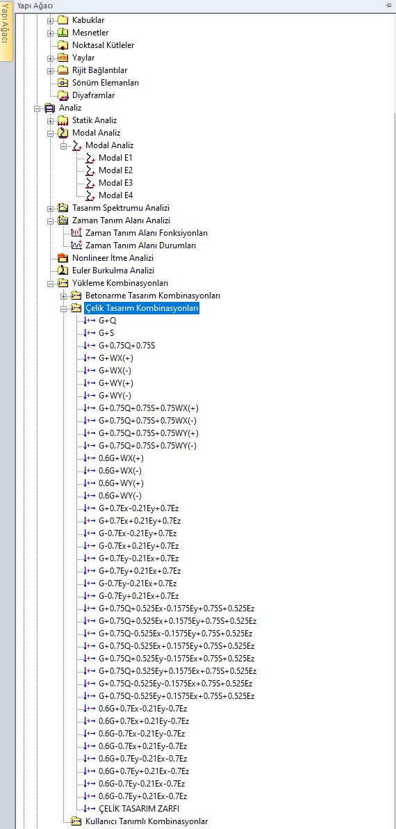 Different loading combinations should be used according to the method used in steel structure design. Loading combinations are arranged automatically according to the selected steel structures regulation and the method belonging to this regulation . The edited combinations are given under three headings: reinforced concrete, steel and user-defined under the subtitle of building tree loading combinations in the interface. All combinations used for reinforced concrete, steel and base pressure control are given in the subtitle of optional report loading situations and loading combinations.