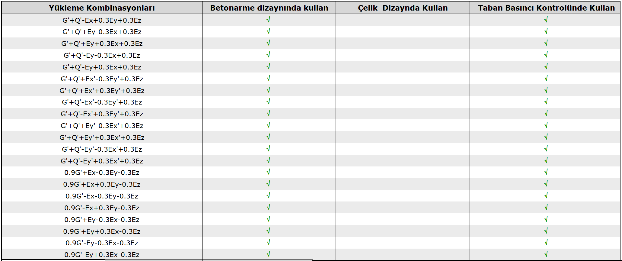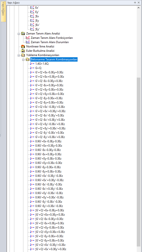 The edited combinations are given under three headings: reinforced concrete, steel and user-defined under the subtitle of building tree loading combinations in the interface. All combinations used for reinforced concrete, steel and base pressure control are given in the subtitle of optional report loading situations and loading combinations.