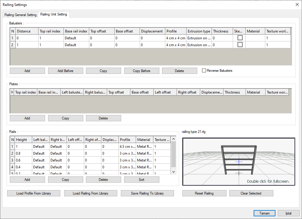 The profiles that have been previously prepared and saved in the archive to be used in the sections of railings, rails, posts or panels are selected and used with the Load Profile From Library button in the Railing Settings dialog.