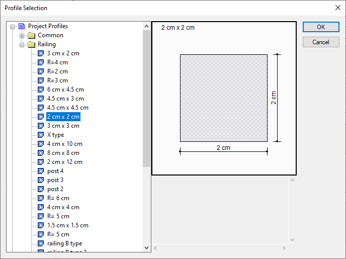 There are profiles in folders in this dialog. Select one of the profiles (For example 2 cm x 2 cm) located under the railing folder.