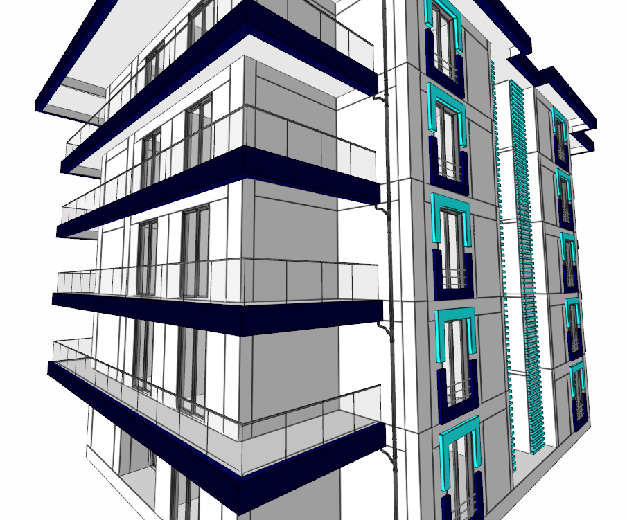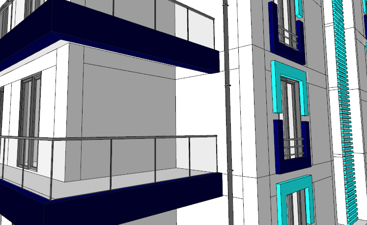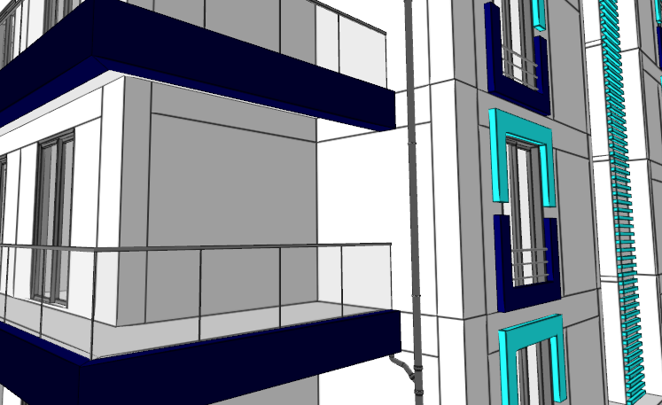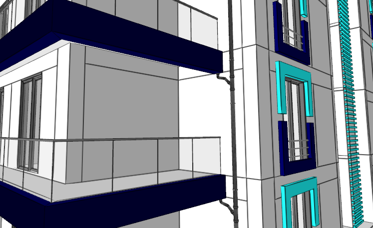 Gutters and balcony drains at different elevations are connected to a single rainwater pipe with the Enable Connectors feature on rainwater pipes.