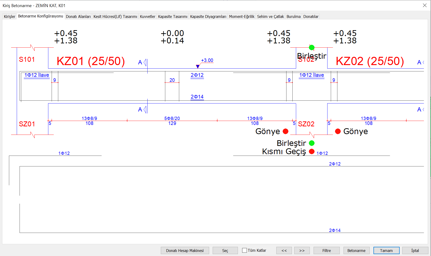 Longitudinal reinforcement conditions and application of clamping length l b can be examined in the Reinforced Concrete Configuration section from the Beam Reinforced Concrete window . In the picture below, an example of Reinforced Concrete Configuration is given.