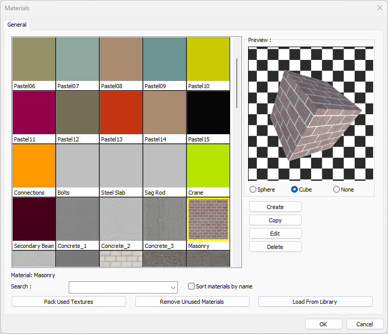 Edit ![]() Changes can be made to the settings of the selected material. |