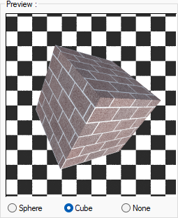 Preview ![]() The image of the selected material to be obtained when rendered is previewed. Sphere The preview is shown on the sphere object. ![]() Cube The preview is shown on the cube object. ![]() None Preview is not shown. ![]() |