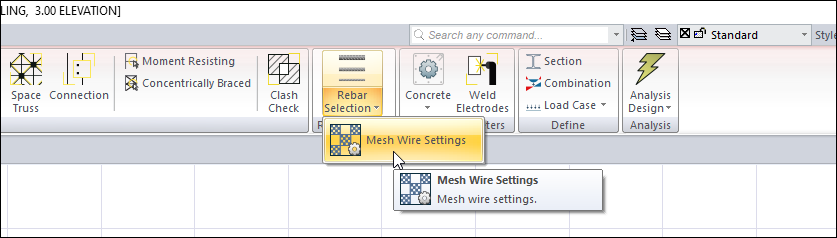 Ribbon menu Analysis and Design tab Reinforcement title under Steel Bar Selection, you can reach the command.