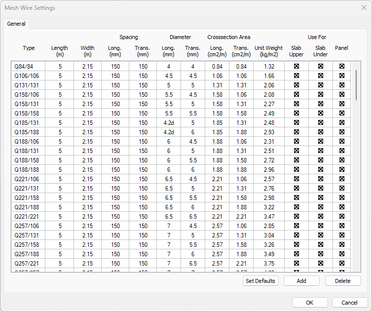 Mesh wire types and usage (slab upside-down or shearwall) are determined with the mesh wire settings command. Mesh wire diameters and spacings vary according to needs. The mesh wire library is defined in the mesh wire settings dialog.