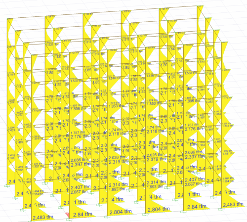 For any (X) earthquake direction, the largest modal response magnitude, r max (X) , is the displacement, relative story drift, and internal force component values. These values are the largest positive (absolute)Since there are values, the concept of direction disappears in this method. Therefore, when examining the results of the mode coupling method analysis (eg Ex internal force diagram), the values shown on the structure do not provide the equilibrium equation. The values seen in the analysis results are the highest possible value of the point of view. In the image below, there are M3 moment results calculated with the mode combination method for the Ex earthquake. As can be seen, there is no negative direction and the equilibrium equation is not met. Because these values on Ex results show the highest M3 value calculated by considering all modes of the relevant point.