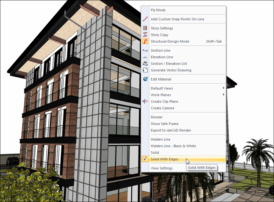 If a solid is selected, the objects entering the image are seen with the material textures assigned to the relevant objects, no boundaries appear between different objects with the same material. If no materials are assigned to the objects, the objects are made solid images with their own line colors.