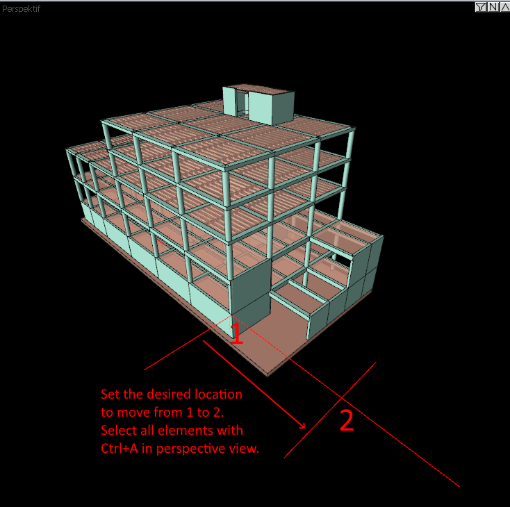 Instead of moving the elements on each story, the entire structure is selected with the "Select All (Ctl+A)" command in the 3D perspective view, and the entire structure is moved at once with the "Move" command.