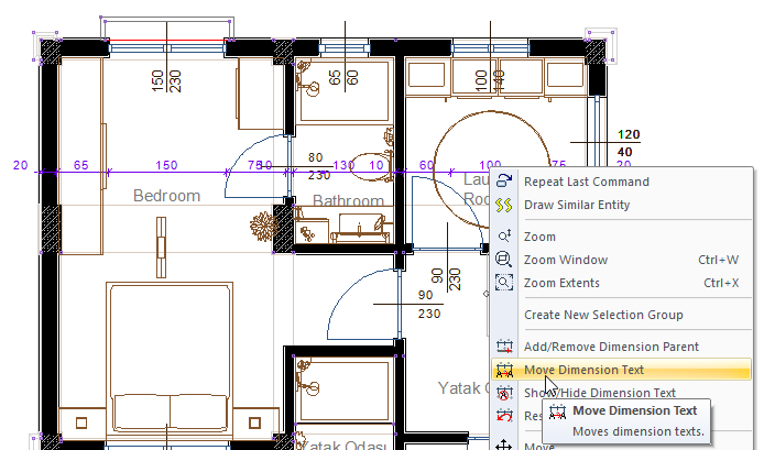 After clicking the right mouse button, click the Move Dimension Text line or the Move Dimension Text icon in the ribbon menu .