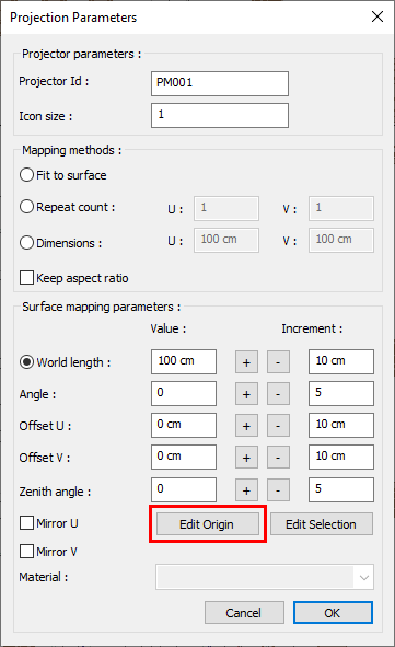 You can access the edit origin feature from the projection parameters dialog that opens when you double-click on the defined planar texture mapper projection .