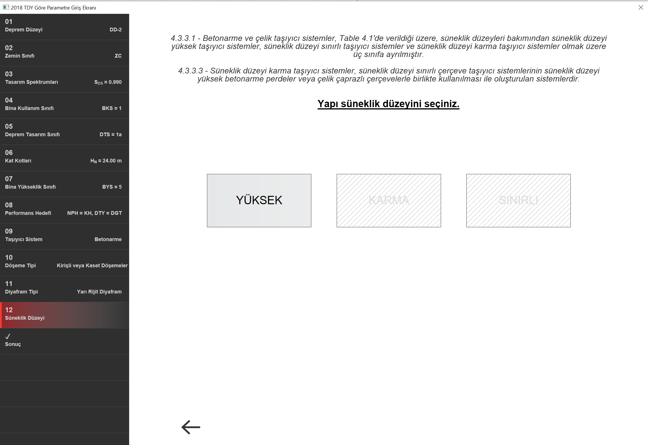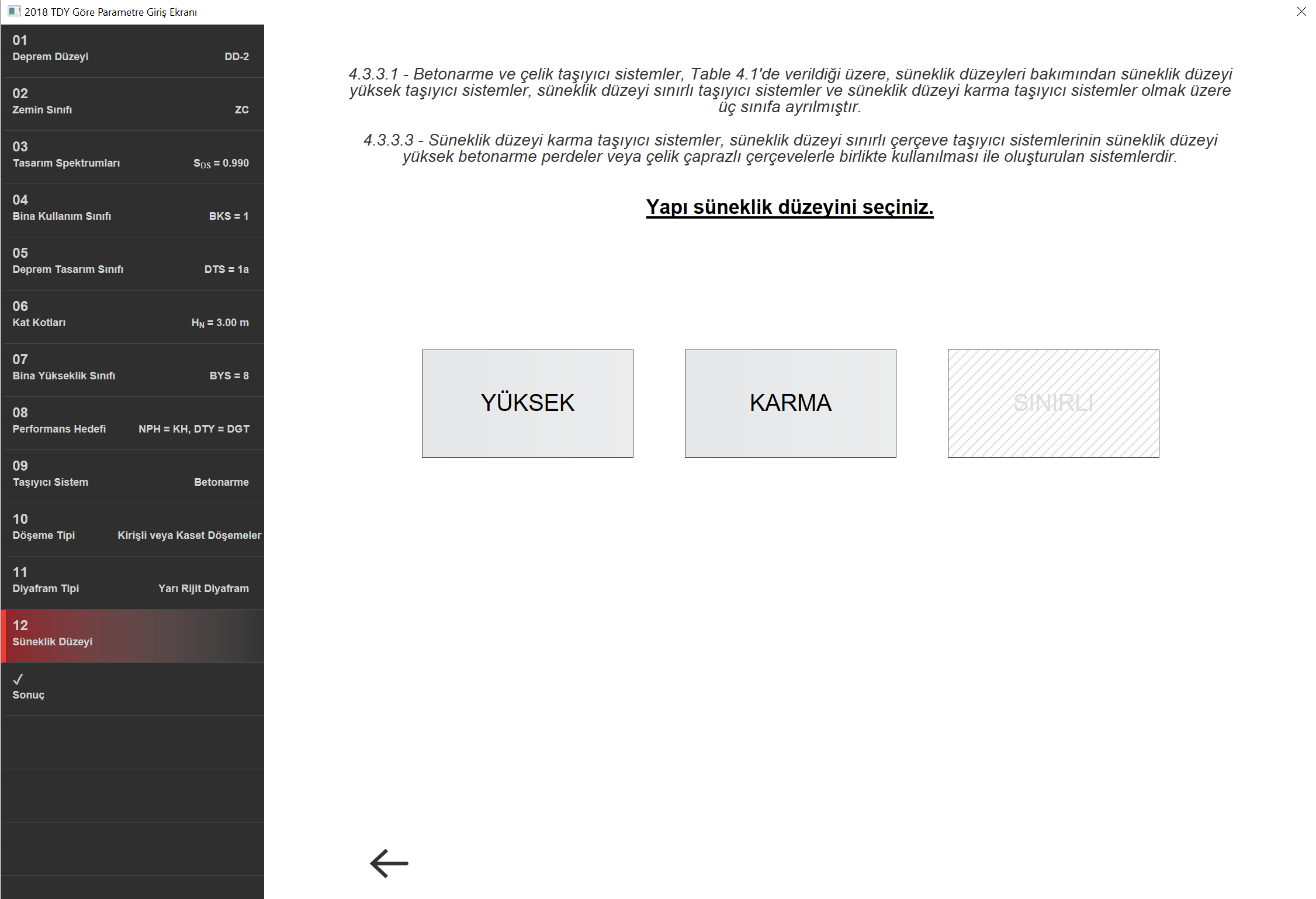With the TBDY 2018 Wizard , ductility level limitations are made automatically according to the classifications in 4.3.4.1 (a) and (b) and the selection of these carrier systems is not allowed with the TBDY 2018 Wizard .