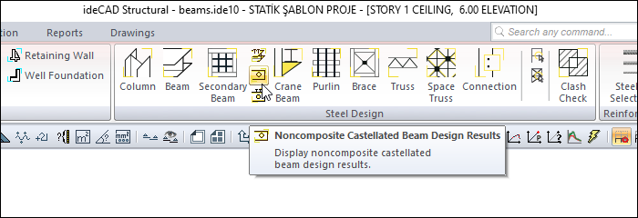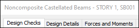 After the analysis is done, you can access it by clicking the Noncomposite Castellated Beam Design Results command under the Steel Design heading in the ribbon menu Analysis and Design tab .
