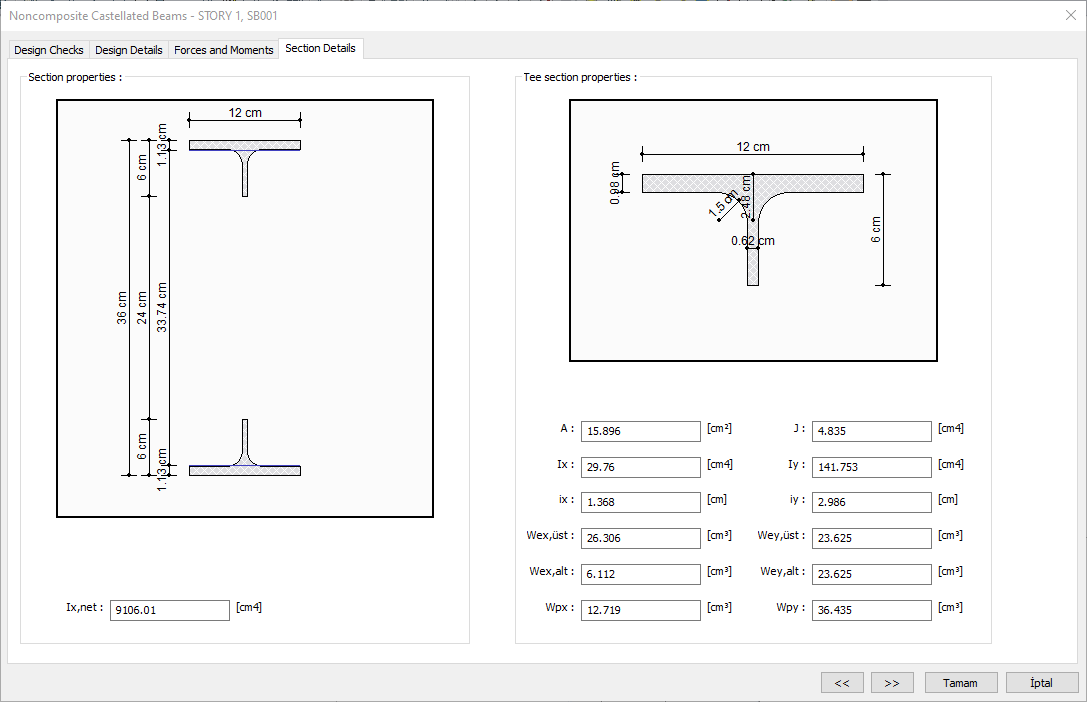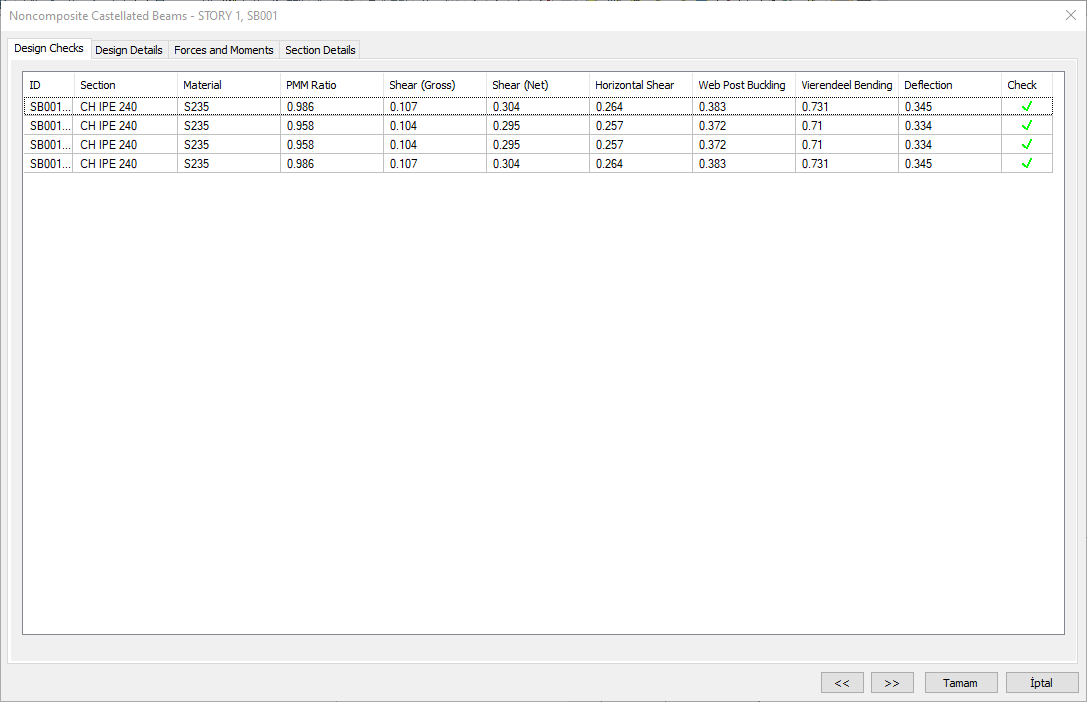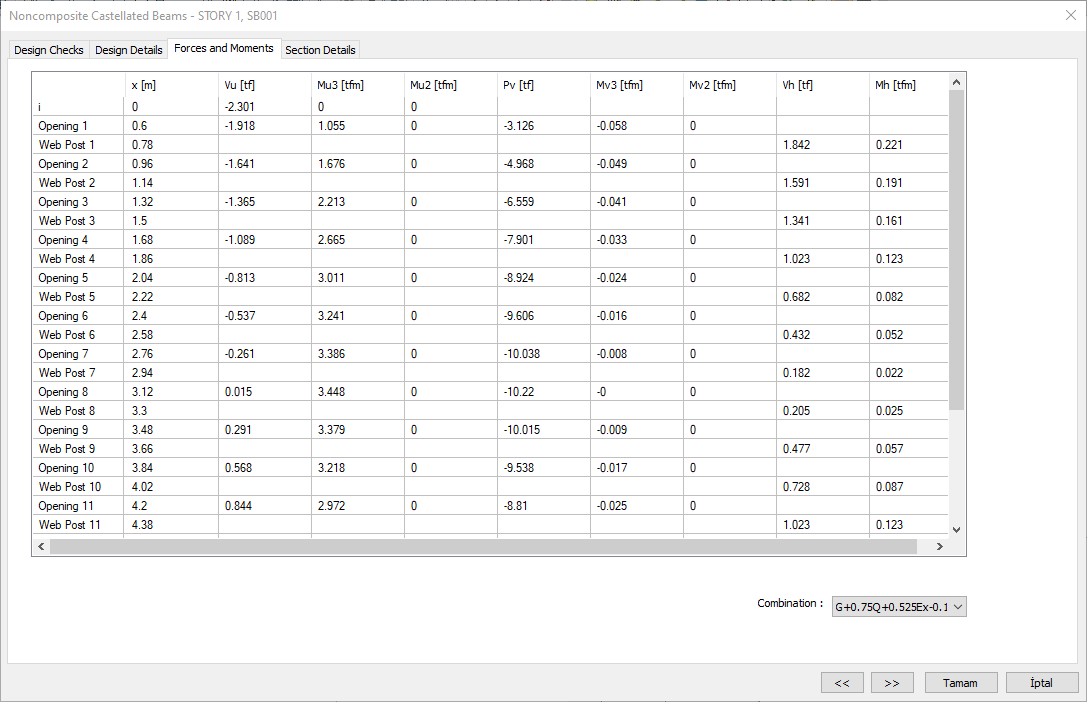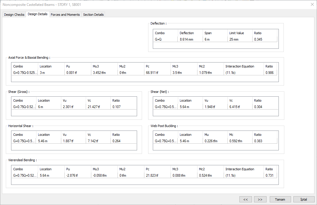 Noncomposite castellated beam design results and noncomposite castellated failure conditions are displayed in the Noncomposite Castellated Beams dialog. In the Noncomposite Castellated Beams dialog, shear, body buckling, vierendeel controls in gross and net area, as well as internal force results and net moment of inertia calculation are also given.