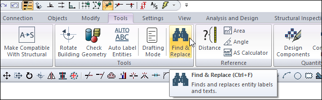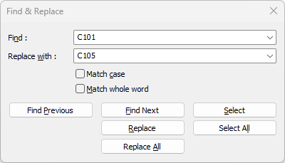 The Find & Replace command finds any object or text that contains the searched text. Zoom the drawing view to that object or text and allows it to be selected. Change the name or text of the found object without entering its settings.
