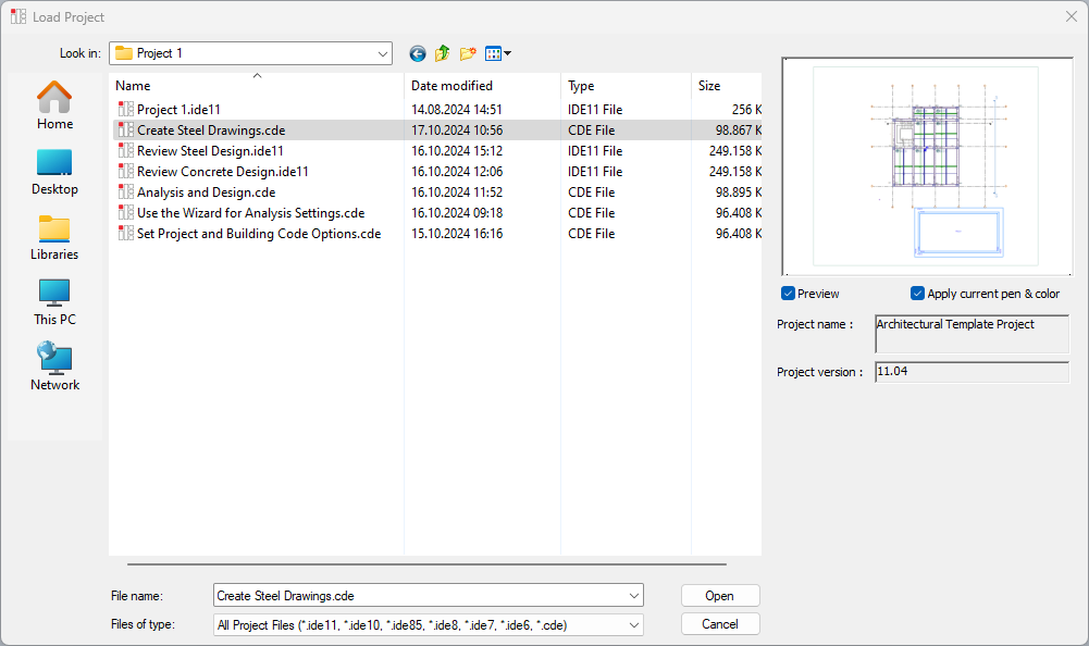 The Open command is used to open an existing project. If the project to be opened from the load project dialog is clicked and the preview image line is active, the image of the project can be viewed in the dialog.