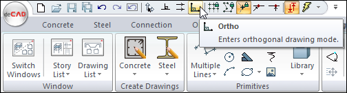 When the ortho icon is pressed, the cursor always remains at 0 and 90 degrees during object drawing.