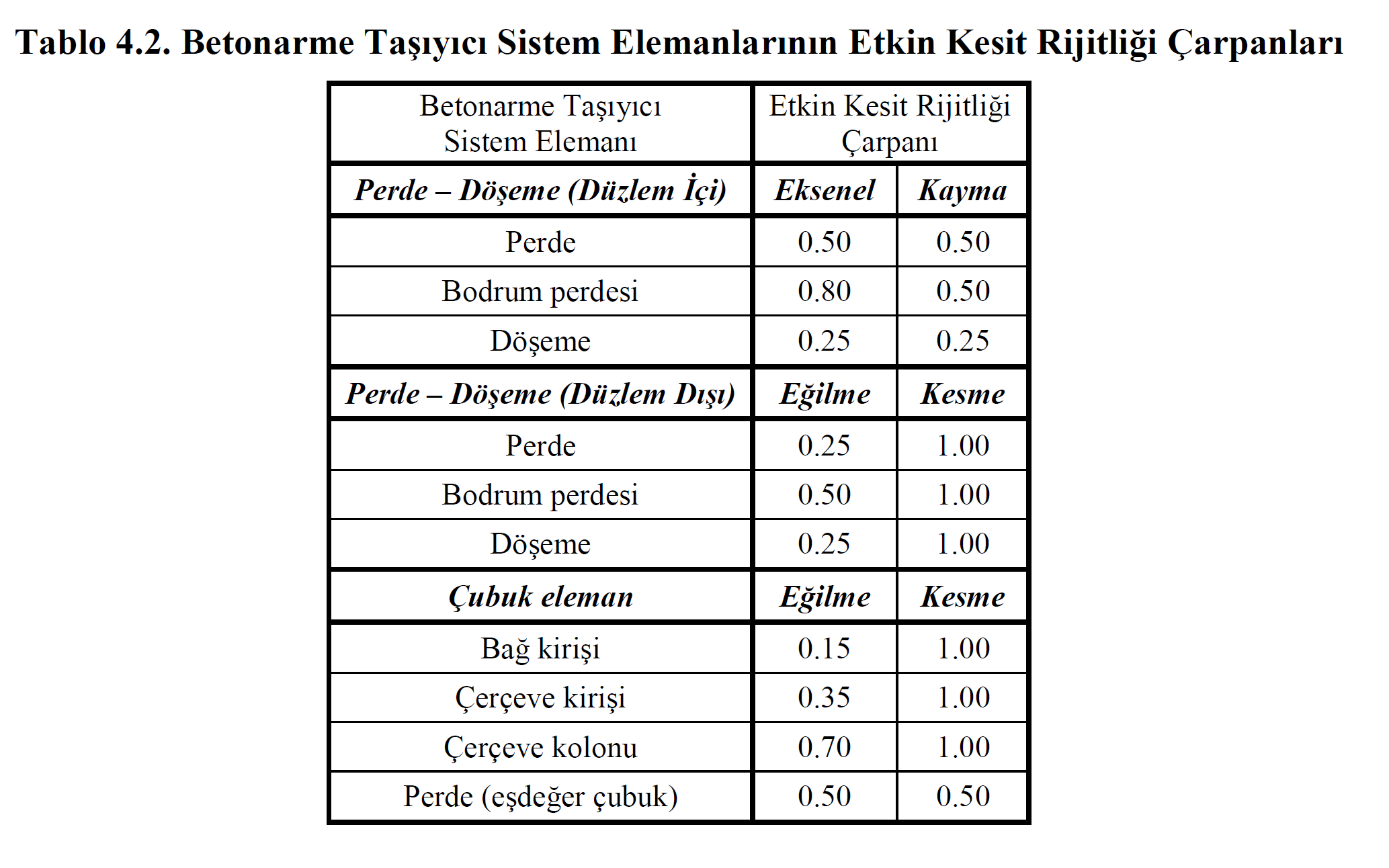 As a second option, the effective section stiffnesses of the linear elements (columns and beams) between the plastic hinges can be determined according to Table 4.2 specified in TBDY Section 4.5.8 . Effective section stiffnesses of columns and beams modeled as linear elements. It is explained in detail under the heading Effective Section Stiffness of Structural System Elements