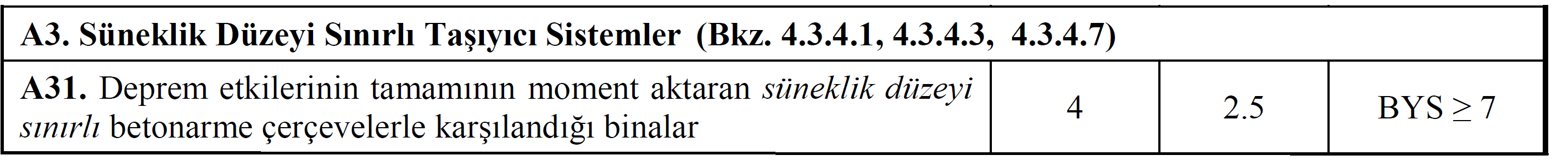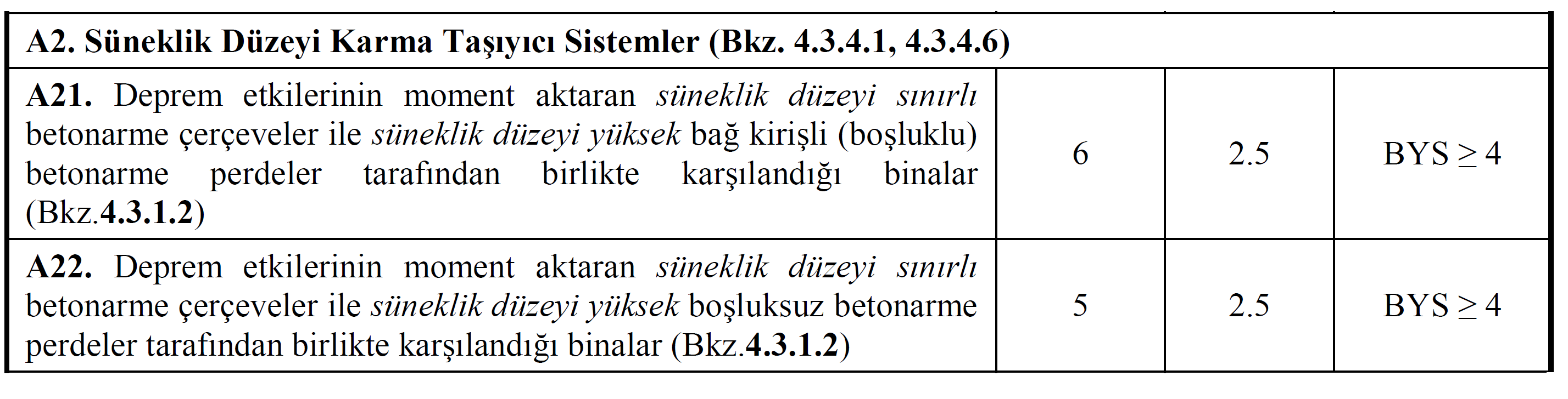In cases where Equation 4.3 provides, the R and D coefficients given in Table 4.1 are taken into account for mixed structural systems of ductility level formed by reinforced concrete frames with limited ductility level and reinforced concrete walls of high ductility level . ( A21 and A22 carrier systems)