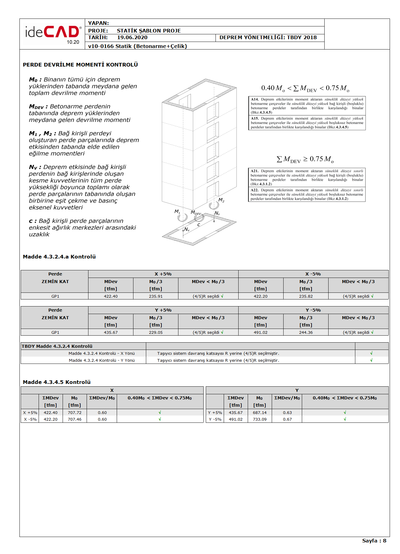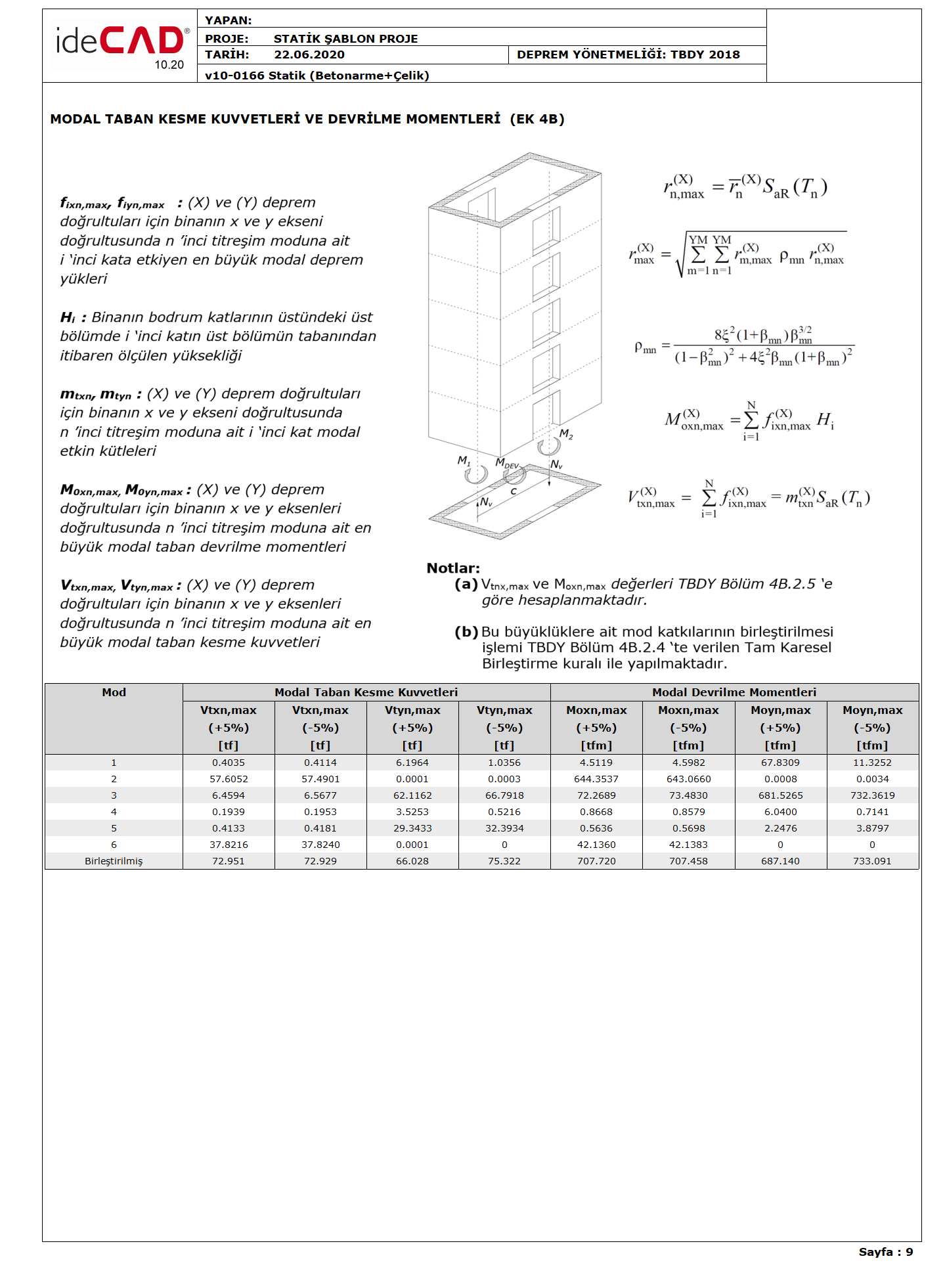 The sum of the overturning moments caused by earthquake loads at the base of the walls, M DEV , the total overturning moment occurring at the base from earthquake loads for the whole building, M o values are calculated by using the modal combination method described in Annex 4B.2.5 of TBDY . Below is a sample report where the modal base shear forces and the corresponding base overturning moment are calculated according to TBDY Annex 4B.2.5 .