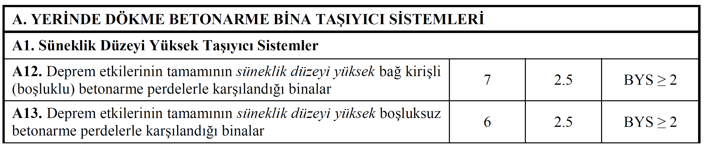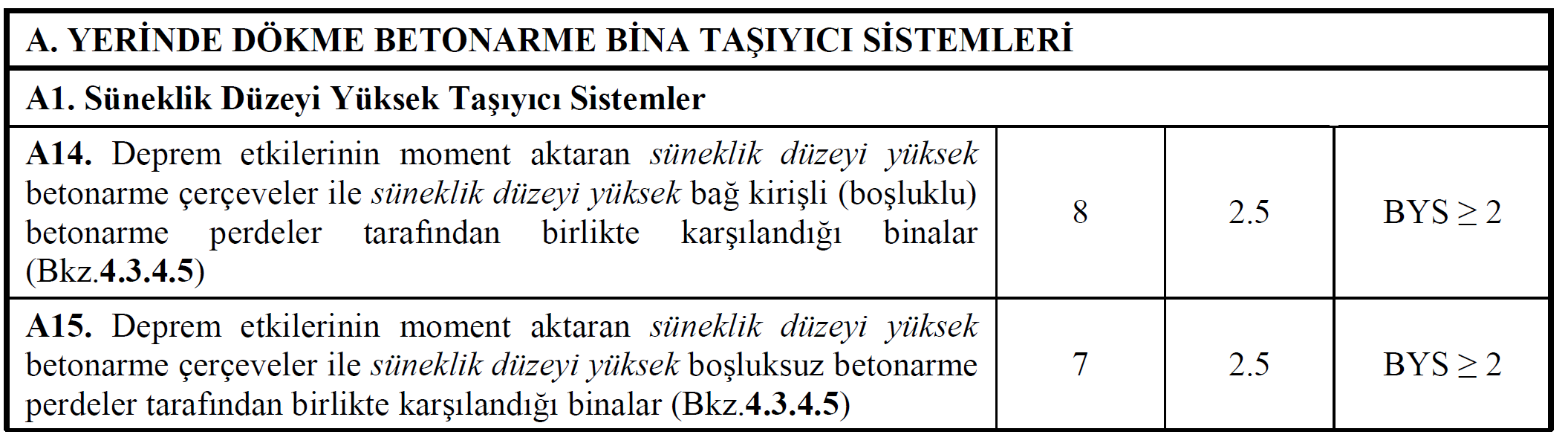 However, since Equation 4.2 upper boundary condition is not fulfilled [∑M DEV > 0.75M o ], it is assumed that all earthquake effects are met with walls with high ductility level with or without gaps. For this reason , A12 or A12 bearing systems should be chosen as the carrier system, even if there are frames that transfer moment in buildings where [∑M DEV > 0.75M o ] condition is not met . In this case, the carrier system behavior coefficient R value will decrease by one.