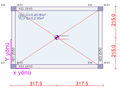 Since the building loads and geometry are symmetrical, the center of mass is the same as the geometric center of gravity. The distance information of the intersection of the line drawn with the cross is shown in the screenshot above.