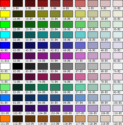 There are numbers in the form of (1-P5), (12-P12) under each color box. The number on the left (1, 12, 113 etc.) indicates the position of the relevant color on the color palette, and the number on the right (P1, P11 etc.) indicates the item number assigned to the corresponding color.