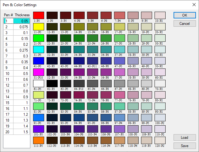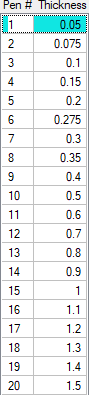 Pen# and Thickness ![]() Item numbers and corresponding pen thicknesses are listed. The values in the thickness column are in millimeters and can be changed. |