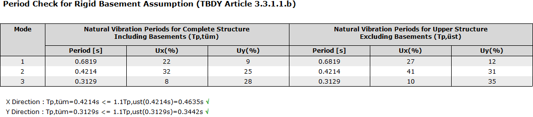 For rigid basement story structures, the required period control in TBDY 2018 Article 3.3.1.1.b is automatically performed in the program and is given under the heading "Period Check for Rigid Basement Assumption" in dynamic analysis reports.