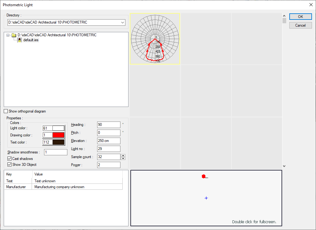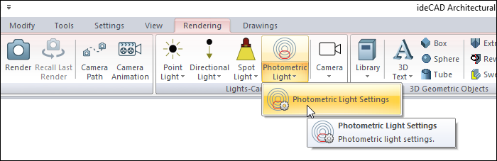 With the Photometric Light Settings command, settings such as the heading, pitch, elevation, light color of the light source are accessed.