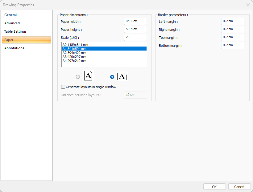 Standard paper sizes ![]() Standard paper sizes are listed. The layout size can be selected from the list, as well as the layout dimensions can be determined by entering the width and height values. |