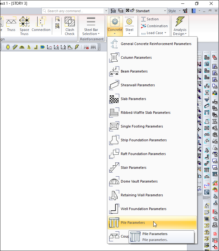 With the Pile Parameters command, the design parameters used in the Concrete Pile Design modeled with the Concrete Raft Foundation are determined. Concrete cover, maximum and minimum reinforcement percentage, type of pile (friction pile, end bearing pile) etc. parameters are determined from the pile parameters window.