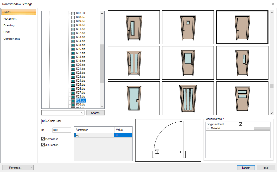 Select 1.50/doors/simple/single leaf/K29.dio from the list in the types tab.