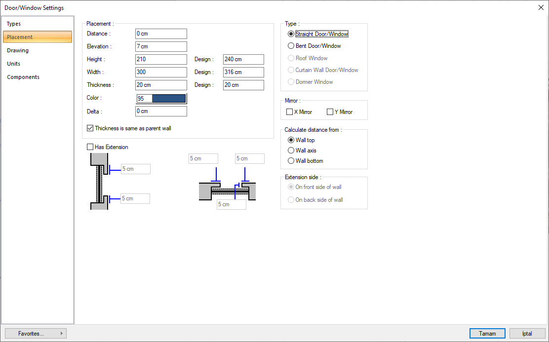 In the placement tab, set the height value to 210 cm and the width to 300 cm. Click the OK button to close the dialog.