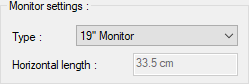 Type, Horizontal Length ![]() Which type of monitor is used is determined here. The list includes 5 different monitor types and Custom Monitor options. The Horizontal Length parameter will be changed automatically when the inch value of the monitor used is selected. If the horizontal length of the monitor does not match the value shown in the Horizontal Length parameter, or if another monitor type is used, the Custom Monitor option is selected from the list. When the custom monitor is selected, the Horizontal length parameter will become active. The horizontal length of the display part of the monitor is measured with a ruler and the value found is entered as the Horizontal Length parameter. |