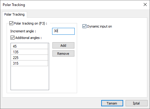 With polar tracking , the drawing is made by jumping to the defined angles and increment angle multiples while in the drawing command. Additional angles can be added. With the dynamic input feature, drawing is made by entering angle and/or length information from the keyboard without using the coordinate box.