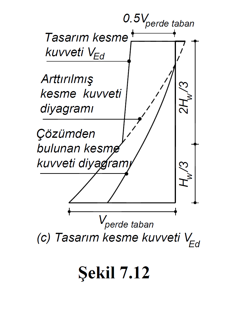 TBDY Figure 7.12 (c) shows the shear force plot of the curtain design. The design shear force at the top of the curtain will be taken as half of the design shear force generated at the curtain base. H w / 3 'to be larger than the portion H w / 3 from the highest point of the screen by shear force at the half of the pitch base received shear force combined with a linear line design shear force will be created.