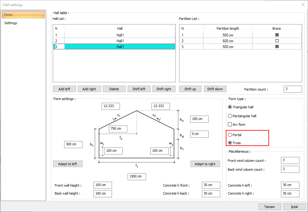 With the portal and truss settings, the selected hall is defined as the beam system defined as portal or the truss system defined as truss from the form type section in the hall settings dialog.