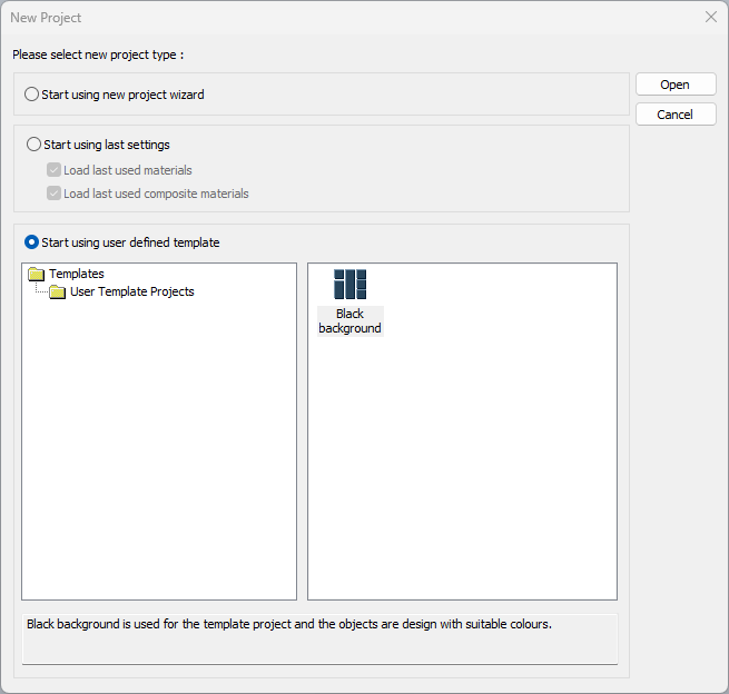 In ideCAD, an empty project with settings, such as project, story, general and object, can be saved as a template. Templates are typical projects. Any previously saved template can be selected when opening a new project. When the project is opened, the settings of the selected template are activated in the new project.